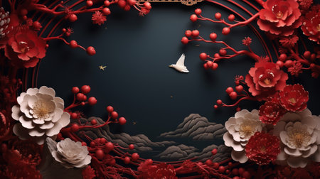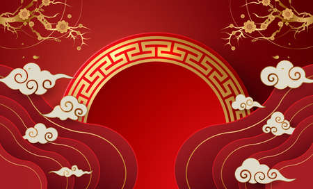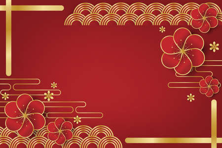 Chinese New Year festival banner design with flowers and clouds on red background for your copy space. Vector illustration.