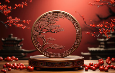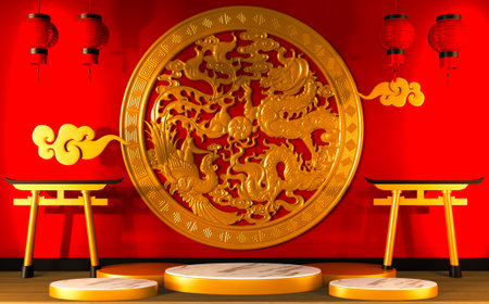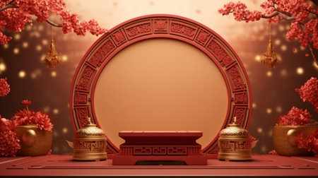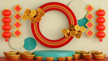 Mock up podium for product presentation show, Chinese style and Asian element for Chinese festival Chinese New Year, 3d render.