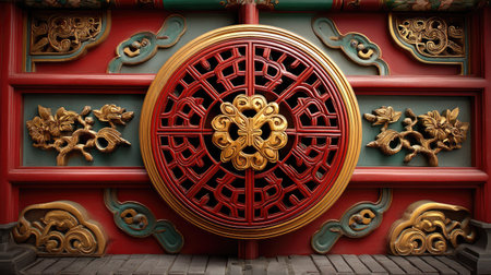 This image showcases a beautifully crafted decorative panel featuring intricate designs and vibrant colors, exemplifying traditional architectural artistry.