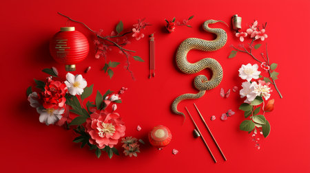 Festive arrangement of red decorations, flowers, and a snake symbolizing prosperity and celebration during cultural festivities