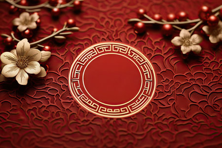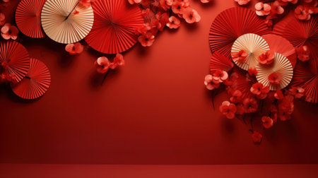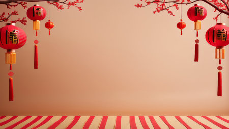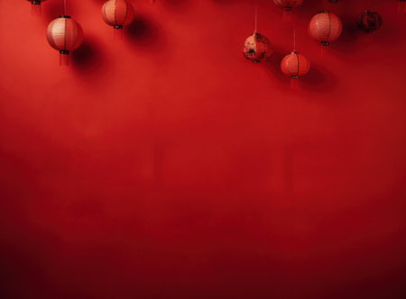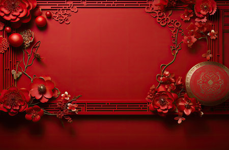 Red-themed Chinese New Year backdrop with traditional decorations, perfect for celebrating the Lunar New Year with cultural significance.