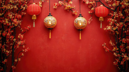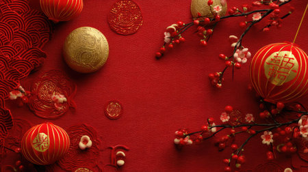 Chinese New Year Decorations in Red and Gold Featuring Lanterns, Flowers, and Ornaments. Concept of Festive Celebration, Cultural Tradition, Holiday Decor, and Vibrant Aesthetics. Background.