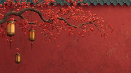 A vibrant red wall features a graceful branch of cherry blossoms with glowing lanterns hanging beneath. This setting reflects cultural significance and tranquility, creating a peaceful atmosphere.