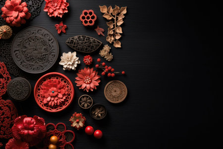 Top view Chinese New year symbols, flat lay copy space. Chinese new year festival decoration over black background. Traditional lunar new year.