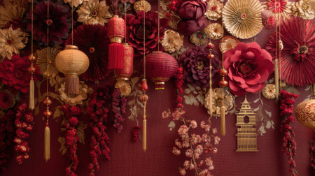 This vibrant image showcases rich red and gold decorations, including lanterns and floral accents, perfect for traditional celebrations and events.