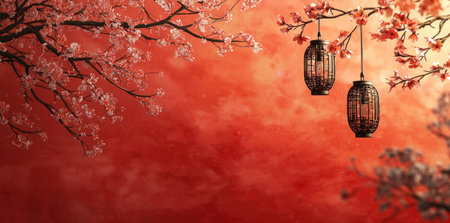 Serene scene of cherry blossoms in bloom against a warm red background, featuring traditional lanterns hanging amidst delicate petals. Harmony and tranquility concept.