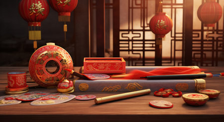 This image features an exquisite arrangement of traditional Chinese decorative items, showcasing vibrant reds and intricate designs, perfect for cultural celebrations.