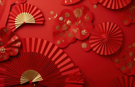 A stunning array of red and gold decorations featuring lanterns, paper fans, and flowers, perfect for festive events and cultural celebrations.