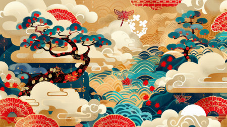 Pattern modern with dragonflies, bonsai, and clouds in oriental style. Gold geometric background.