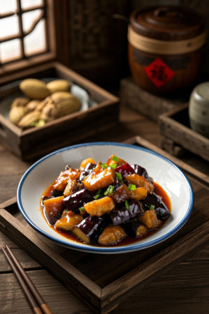 A stunning display of Asian cuisine featuring a sweet and sour dish served in a beautifully decorated bowl. This vibrant presentation is perfect for showcasing culinary artistry.