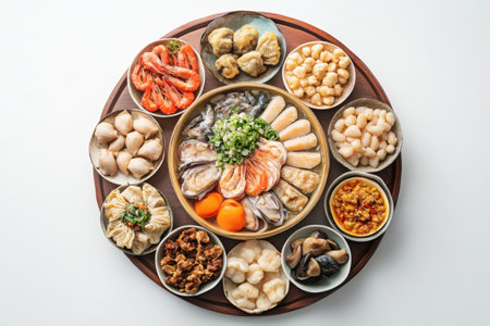 An impressive seafood platter showcases fresh shrimp, oysters, scallops, and an assortment of dumplings, beautifully arranged on a round wooden tray, ideal for a festive feast.