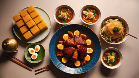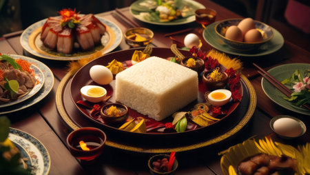 Asian Feast with Rice, Eggs, Sauces, and Elaborate Traditional Food Plating