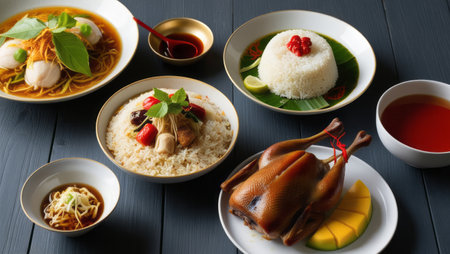 A vibrant spread of Asian cuisine featuring a variety of dishes, fresh ingredients, and artistic presentation on a rustic wooden table. Perfect for showcasing culinary delights.
