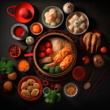 An overhead shot showcases diverse Asian dishes on a wooden table. The composition highlights multiple plates of prepared food, including dumplings and other delicacies. Warm lighting and a close-up perspective create a visually appealing arrangement, suitable for culinary presentations or food-related publications.