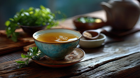 A serene composition featuring a herbal tea in a rustic ceramic cup placed on a weathered wooden table. Surrounding elements include fresh herbs and a small bowl of honey, emphasizing natural wellness and relaxation. This inviting scene promotes a connection to nature and tranquility, perfect for wellness themes or culinary art.