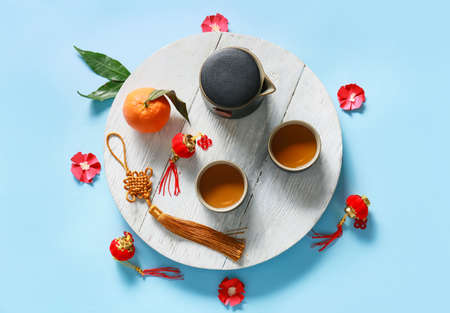 Traditional tea with Chinese symbols on blue background