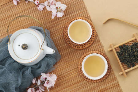 Tea ceremony with teapot and tea cups top view with copy space. Asian tea ceremony.