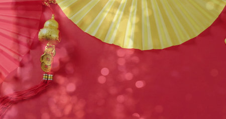 Image of glowing lights over chinese traditional decorations on red background. Chinese new year, festivity, celebration and tradition concept digitally generated image.