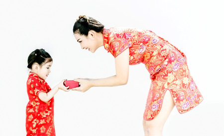 Asian mother and daughter in traditional cheongsam with copy space isolated on red background.The Chinese characters translated as:spring,blessing