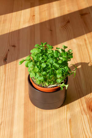 Microgreens sprouts in pot. Home plant and fresh herbs. Vegan and healthy eating and green living concept. Organic food. Greenery on wooden windowsill.