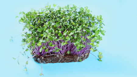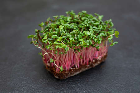 Micro greens for salads, sandwiches, smoothies. Close up of micro greenery samurai. Pleasant taste with notes of radish. Copy of the space, close-up