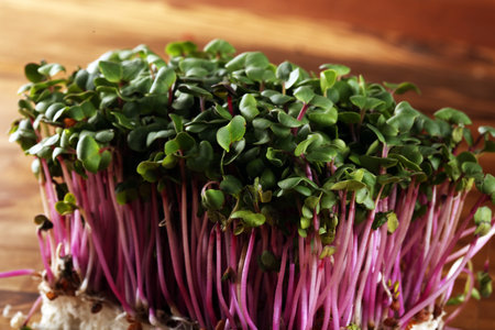 Microgreen kress, pink radish sprouts on rustic background, vegan, vegetarian, healthy eating concept.