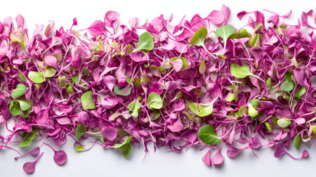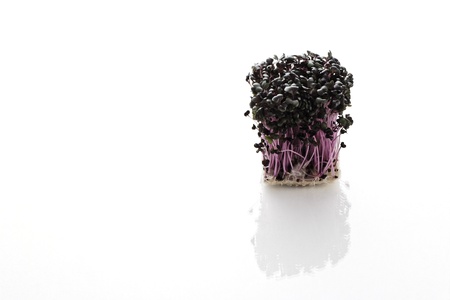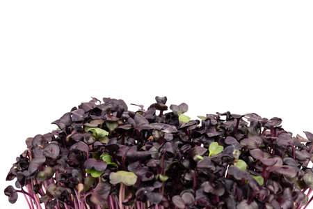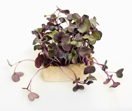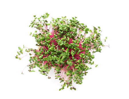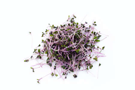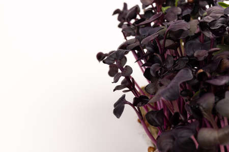 Fresh purple radish sprouts on white background. microgreens. Vegan and healthy eating concept.