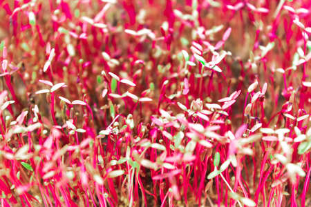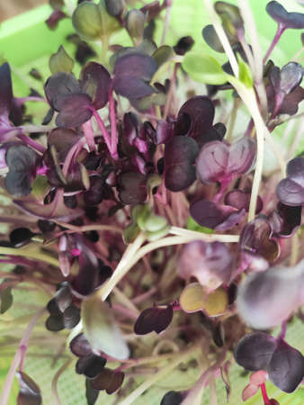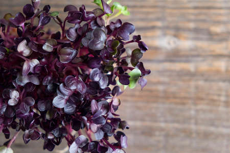 Healthy eating microgreens concept. Tender young purple radish leaves close up selective focus texture background overhead view