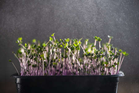 Fresh purple radish sprouts on black background. microgreens. Vegan and healthy eating concept.
