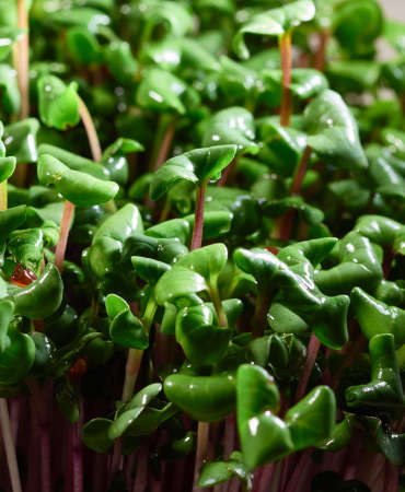Close-up of radish microgreens - green leaves and purple stems. Sprouting Microgreens. Seed Germination at home. Vegan and healthy eating concept. Sprouted Radish Seeds, Micro greens. Growing sprouts.