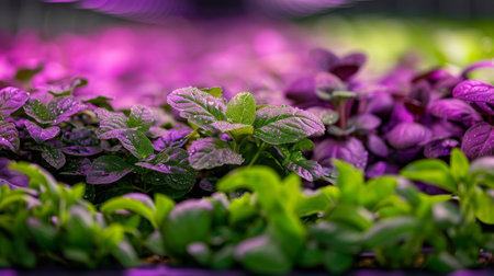 Microgreens Garden under purple LED lights in an indoor farm. Generative AI