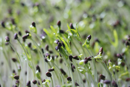 Close-up of microgreens. Seed germination at home. Healthy eating. Growing sprouted seeds.