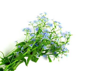 Flower composition. Bouquet forget-me-not flowers on a white background, close-up. Top view, flat lay, place for text, copy space. Spring or summer concept.