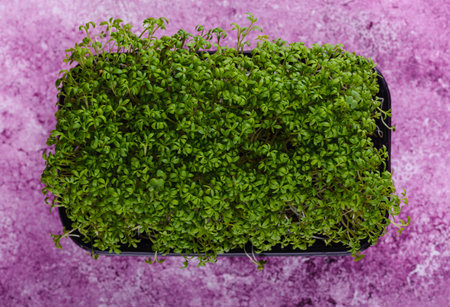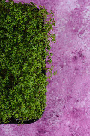 Homegrown cress salad, microgreens in a plastic container, homegrown cress salad, vertical, copy space