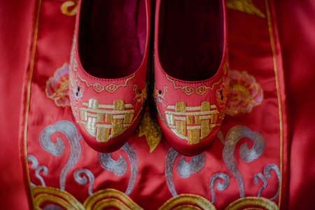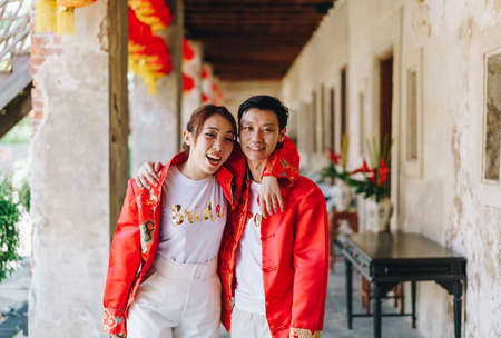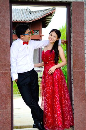 Happy young Asian couple love in Chinese traditional dresses - Red is the main color of the traditional festive that including wedding in China.