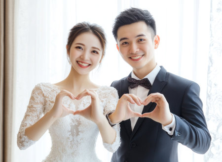 Generative AI : Young asia people happy lover flirt fall in love care trust hand sign tender symbol Just married sweet time comfort asian couple life man woman relax smile showing