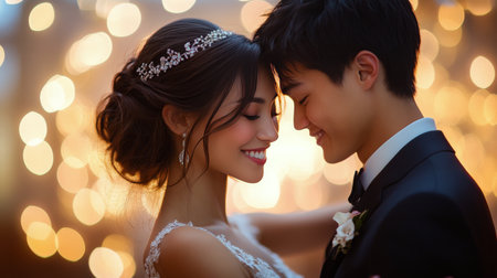 Beautiful Asian couple dressed in wedding attire, the bride holding a bouquet of flowers and the groom in a suit, posing for an elegant wedding photoshoot.