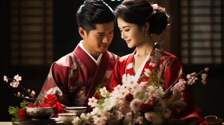 Young asian couple in traditional japanese kimono with flowers and tea ceremony. Generative AI.
