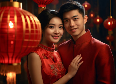 Chinese New Year Mood. Couple in Chinese Wedding Attire and Lanterns - AI Generated