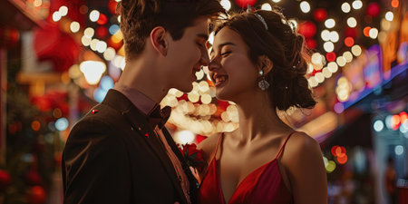 Chinese couple in traditional costume smiling at each other in Chinese New Year