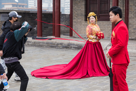 XIAN, CHINA - 10 March 2018 - Chinese photographer takes pre-wedding pictures for the couple on top of the Xian city wall in Xian, China on March 10, 2018