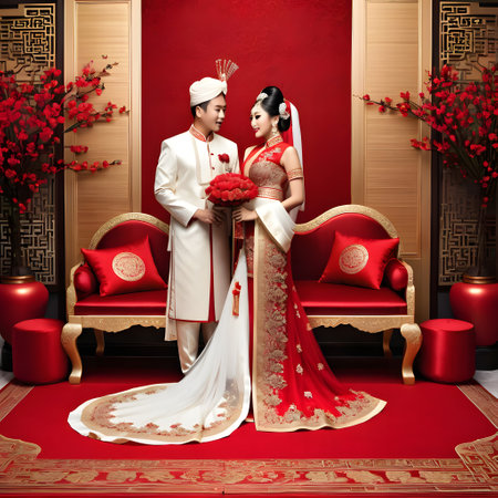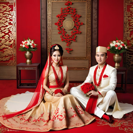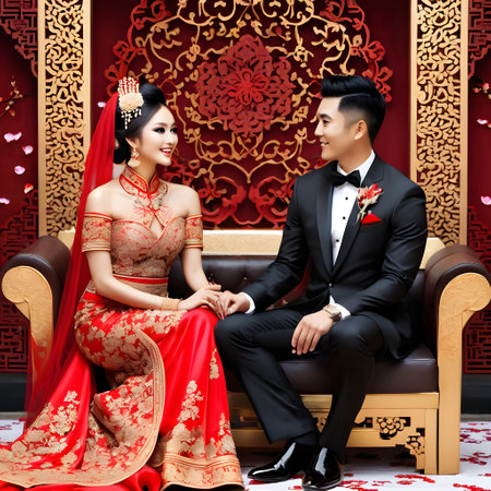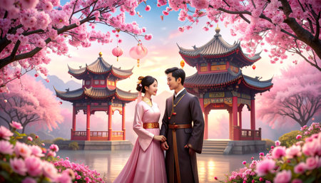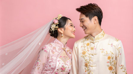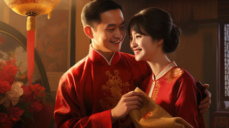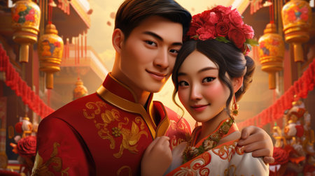 AI Generated. Happy young Asian couple in Chinese traditional dresses