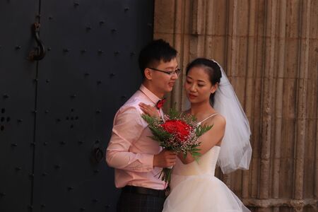 Barcelona, Spain - september 30th, 2019: Bride and groom posing for their wedding pictures near the cathedral of Barcelona