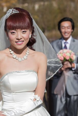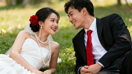 Interracial couple celebrating traditional Chinese wedding outdoors