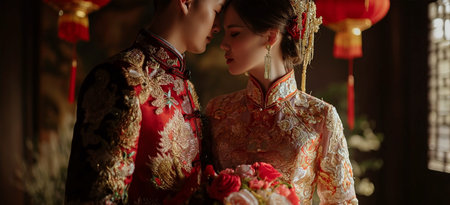 Interracial couple embracing during traditional Chinese wedding ceremony
