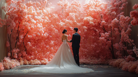 Whimsical Elegance Against a delicate pink backdrop the brides sleeved qipao is lavishly adorned with intricate floral patterns and her veil flows down gracefully. The groom.