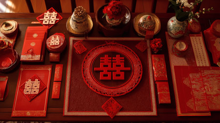 A richly detailed traditional Chinese wedding table arrangement featuring the iconic double happiness symbol, elegant red invitations, antique ceramic jars, red floral accents, and auspicious decorations. This cultural display reflects themes of love, unity, and prosperity ideal for wedding content, cultural showcases, and festive planning inspiration.