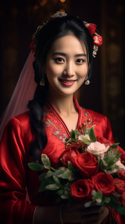 Asian couple in Chinese traditional costume holding a bouquet of flowers