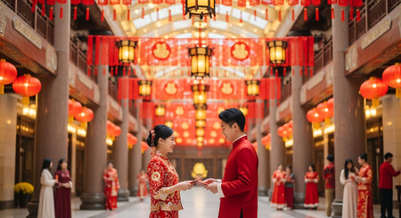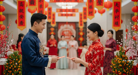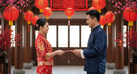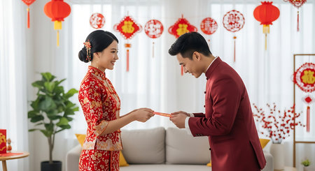 Chinese couple in traditional cheongsam holding red envelopes during Chinese New Year