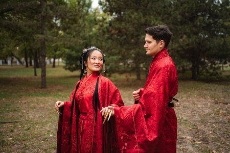 Interracial couple celebrating wedding wearing traditional red Chinese hanfu
